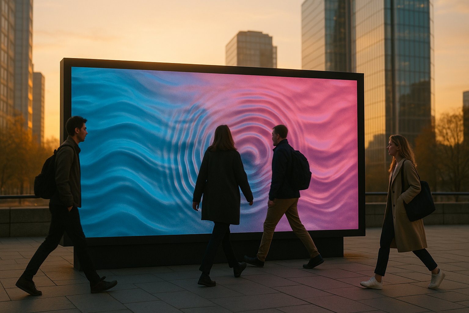 A large format DOOH screen that reads aggregated biometric data from passers by heart rate, skin temperature proxy and shifts colour and copy in real time.