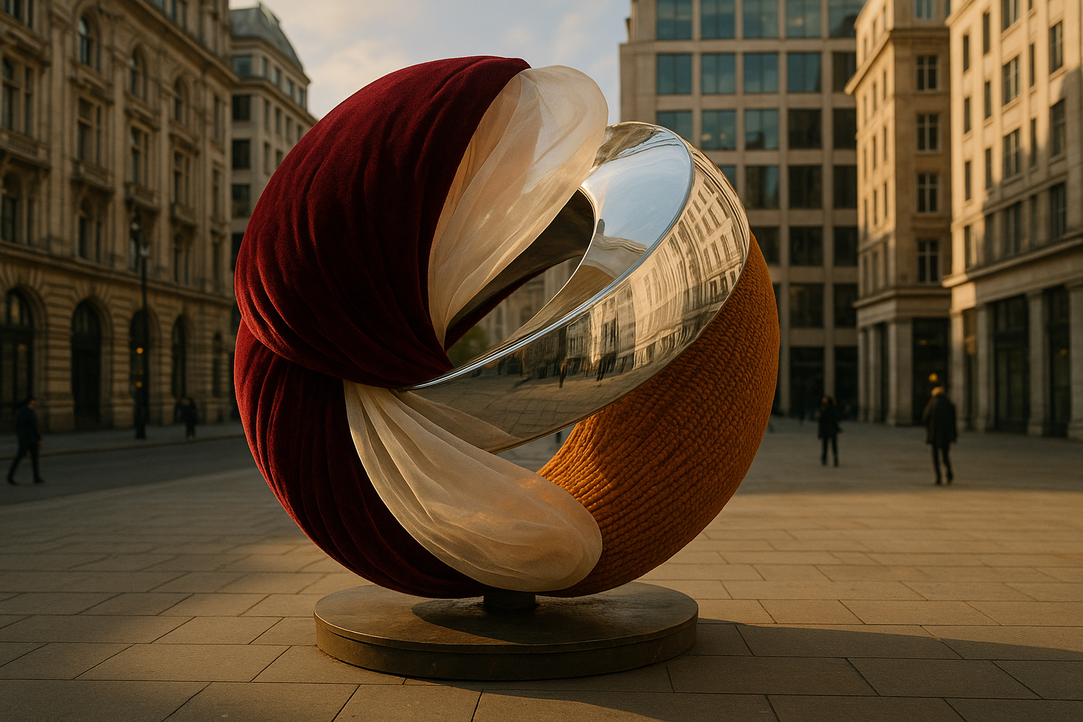 A large mixed material sphere velvet mesh, mirror in a city square.