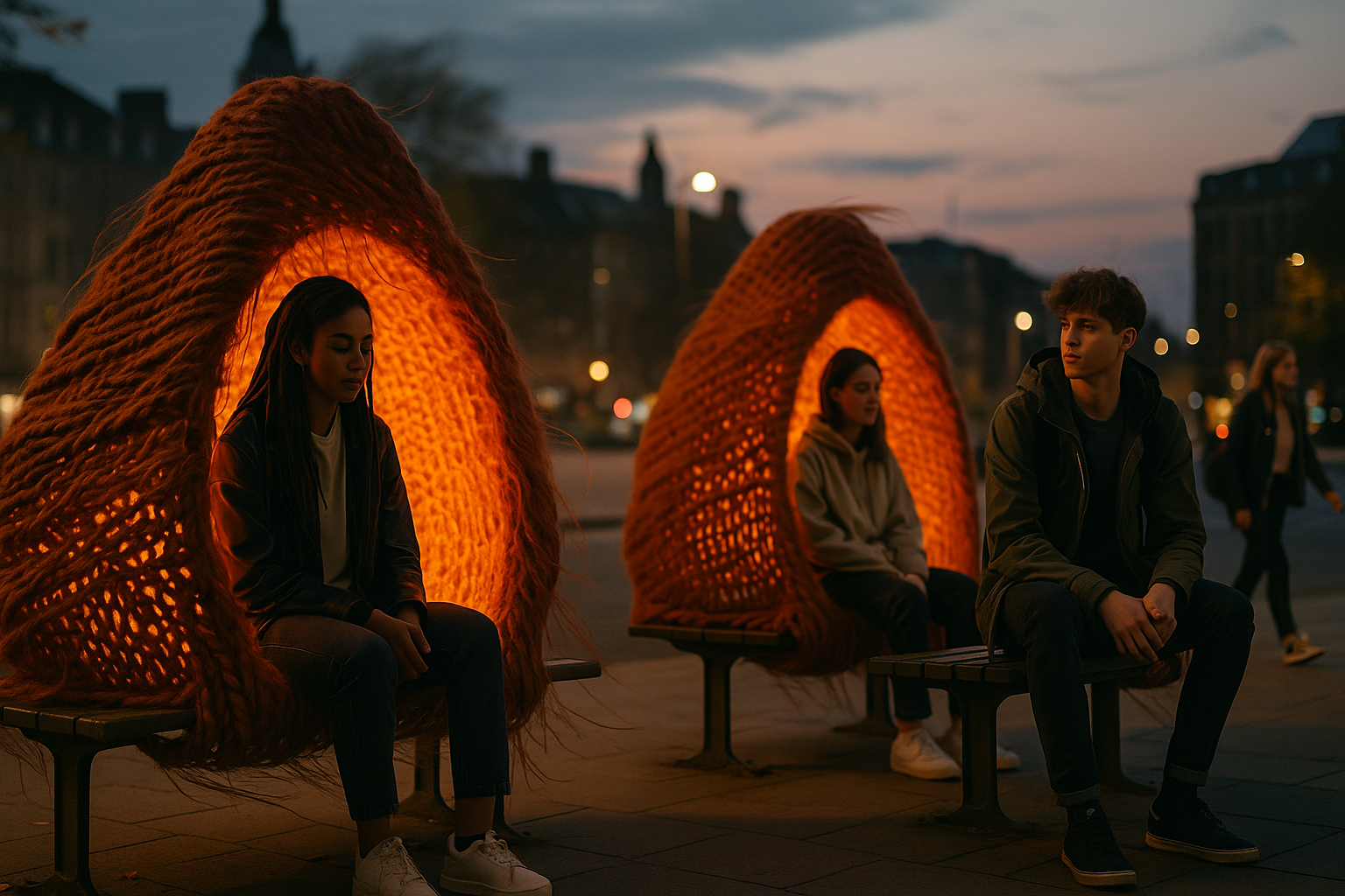 Six illuminated cocoon seats across Shoreditch, Southbank, and King's Cross, colour coded to each phase, glowing differently across the day to mirror the cycle arc.